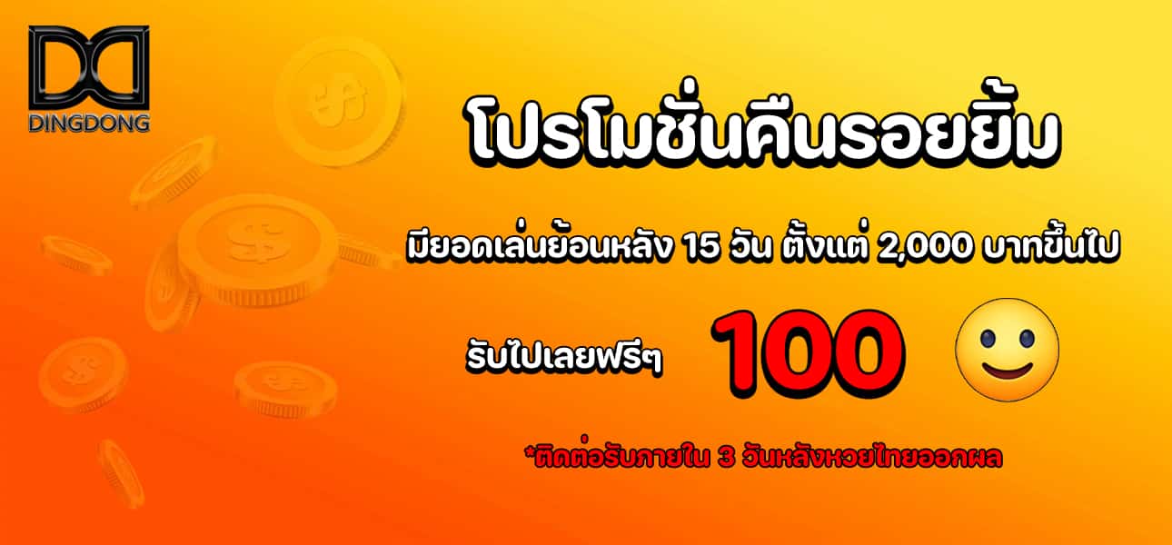 เพื่อตอบแทนคุณลูกค้าทุกๆ ท่านที่เลือกพวกเรา DINGDONG พวกเราอยากมอบรอยยิ้มเล็กๆ น้อยๆ คืนกลับไปให้ลูกค้าที่น่ารักทุกท่าน เพียงมียอดเล่นตั้งแต่ 2,000 บาทขึ้นไปภายในระยะเวลา 15 วันย้อนหลังหลังหวยไทยออกผลสามารถติดต่อรับเครดิตได้เลยฟรีๆ 100 บาท